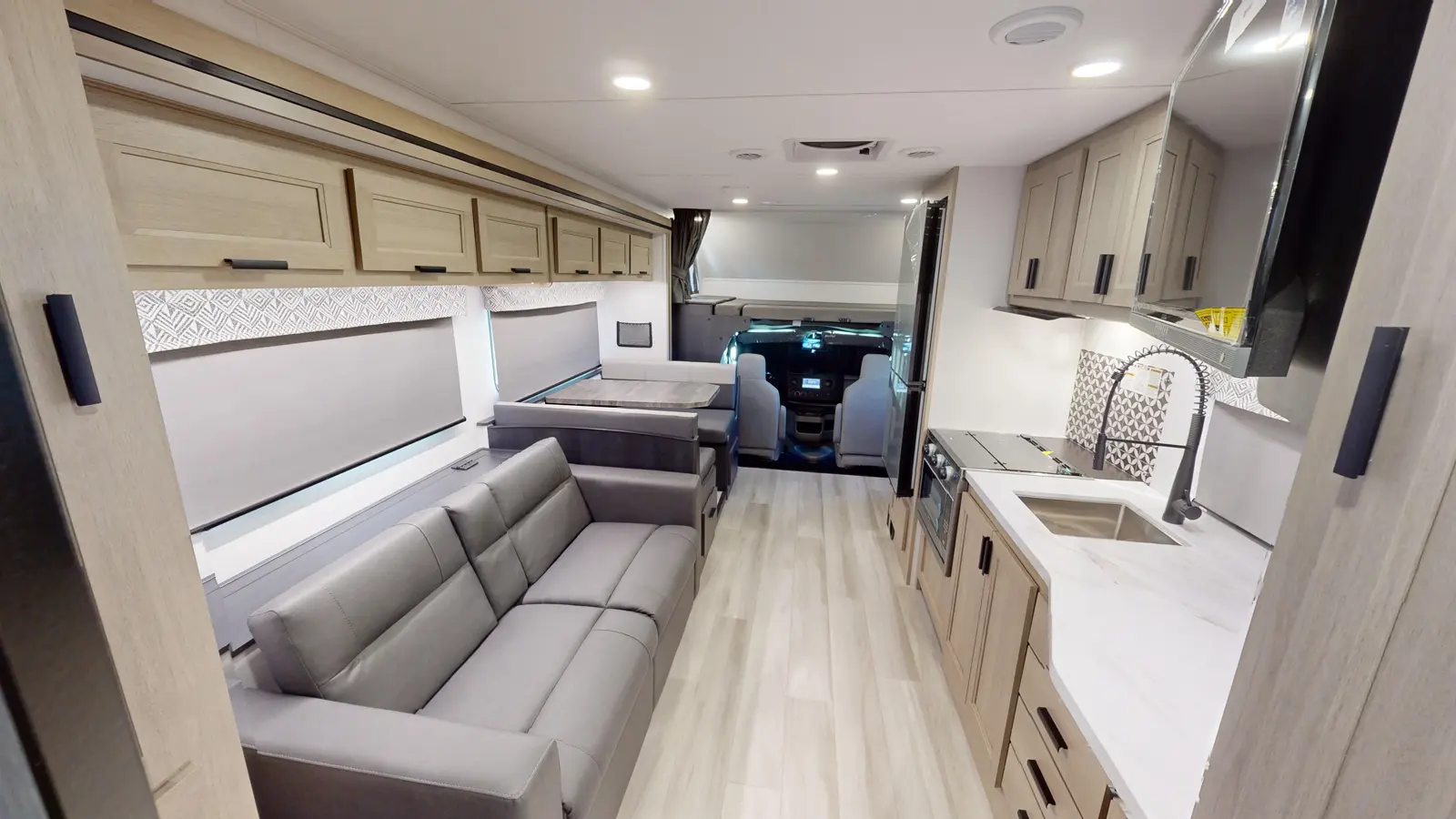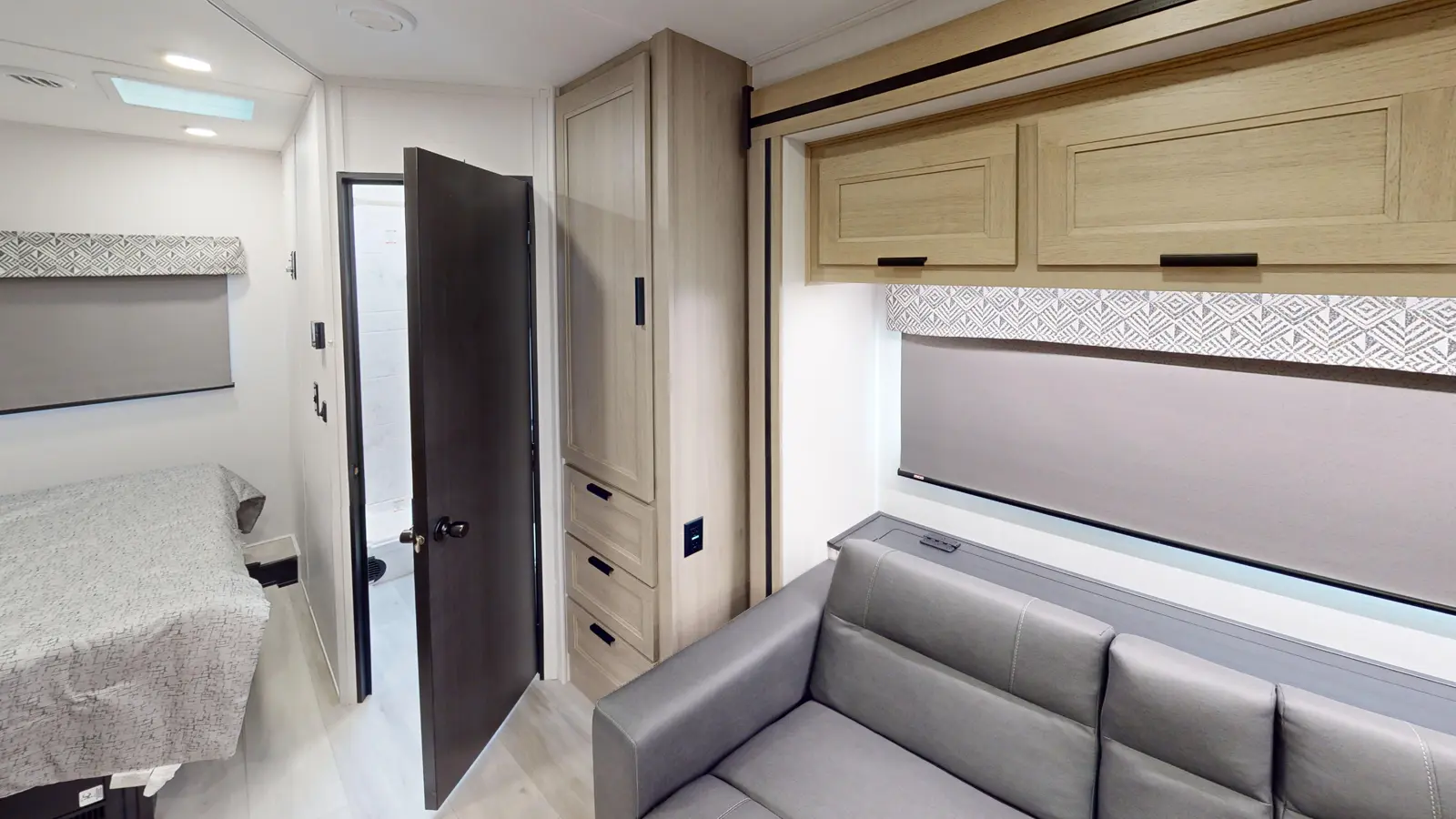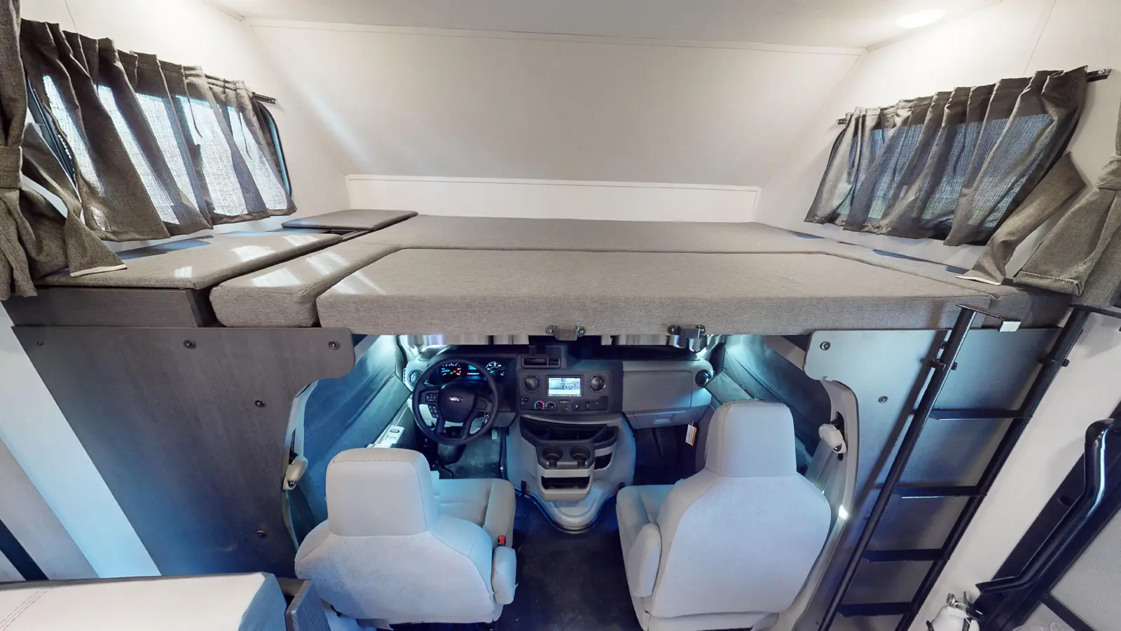 The Forester 2551DSLE kitchen features an undermount convection microwave and 10 cu. ft. refrigerator, plus a 12V TV with work station below. There's a pantry and wardrobe next to the bedroom. You'll enjoy a queen bed, a divider for privacy, and you can add your own TV thanks to the prewired location. The full bathroom includes linen storage just outside the door. And the furniture and bunk over cab provide sleeping space for your guests. This model is built on a Ford E450 chassis.