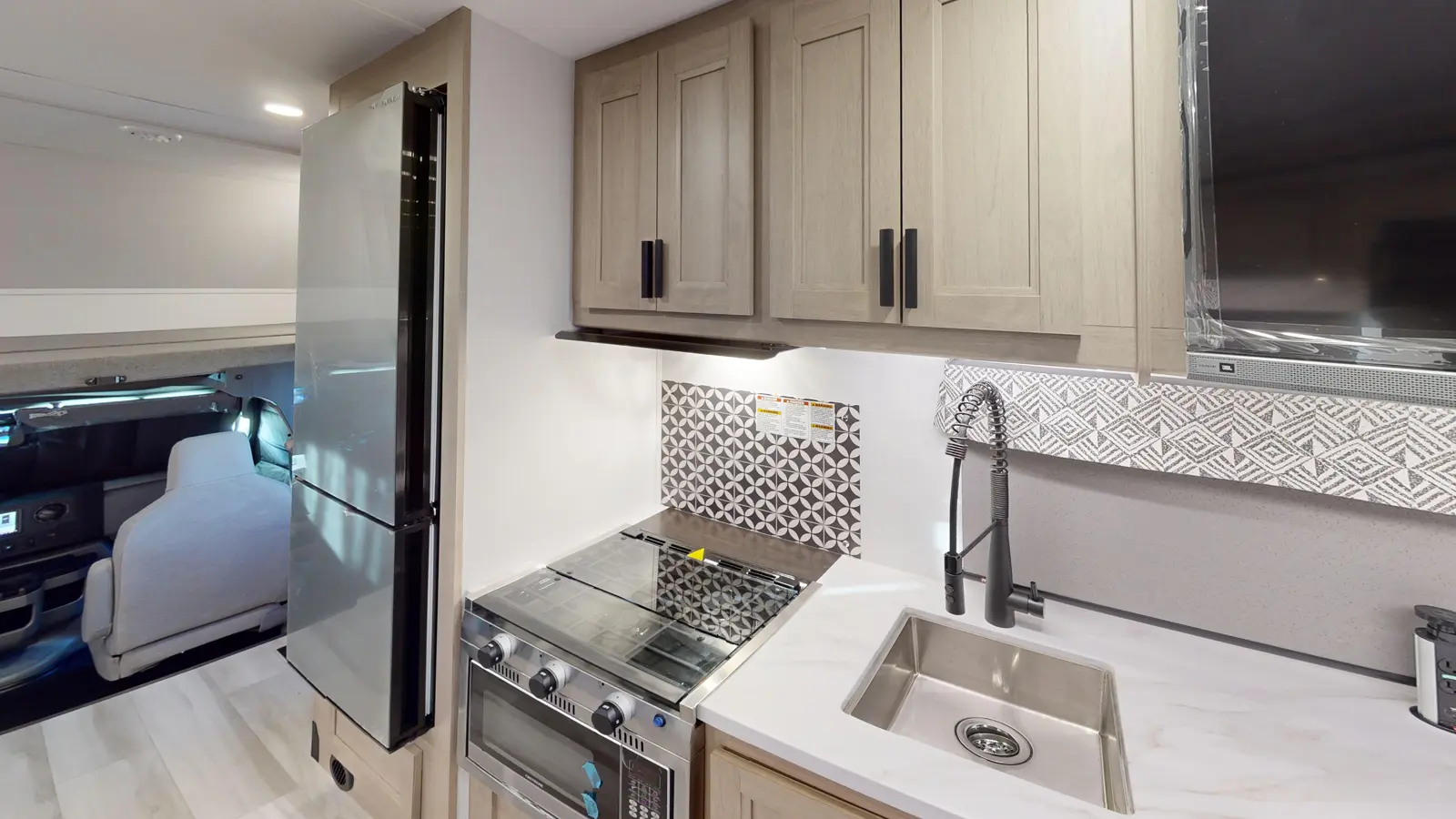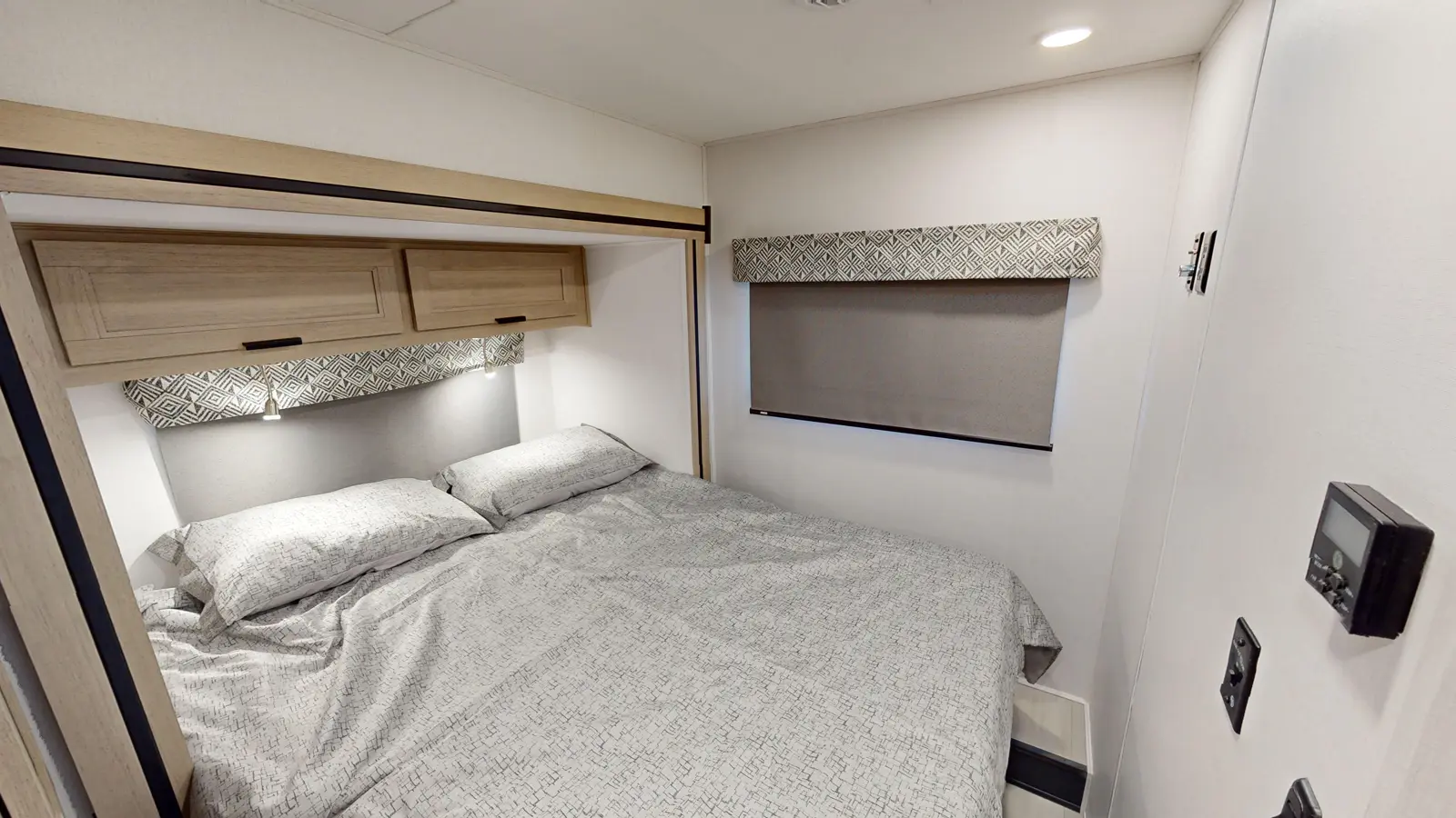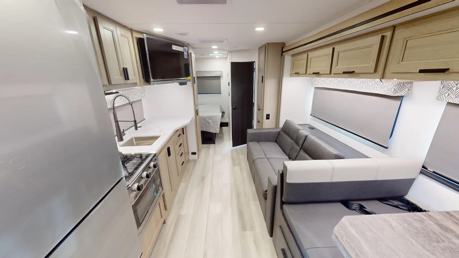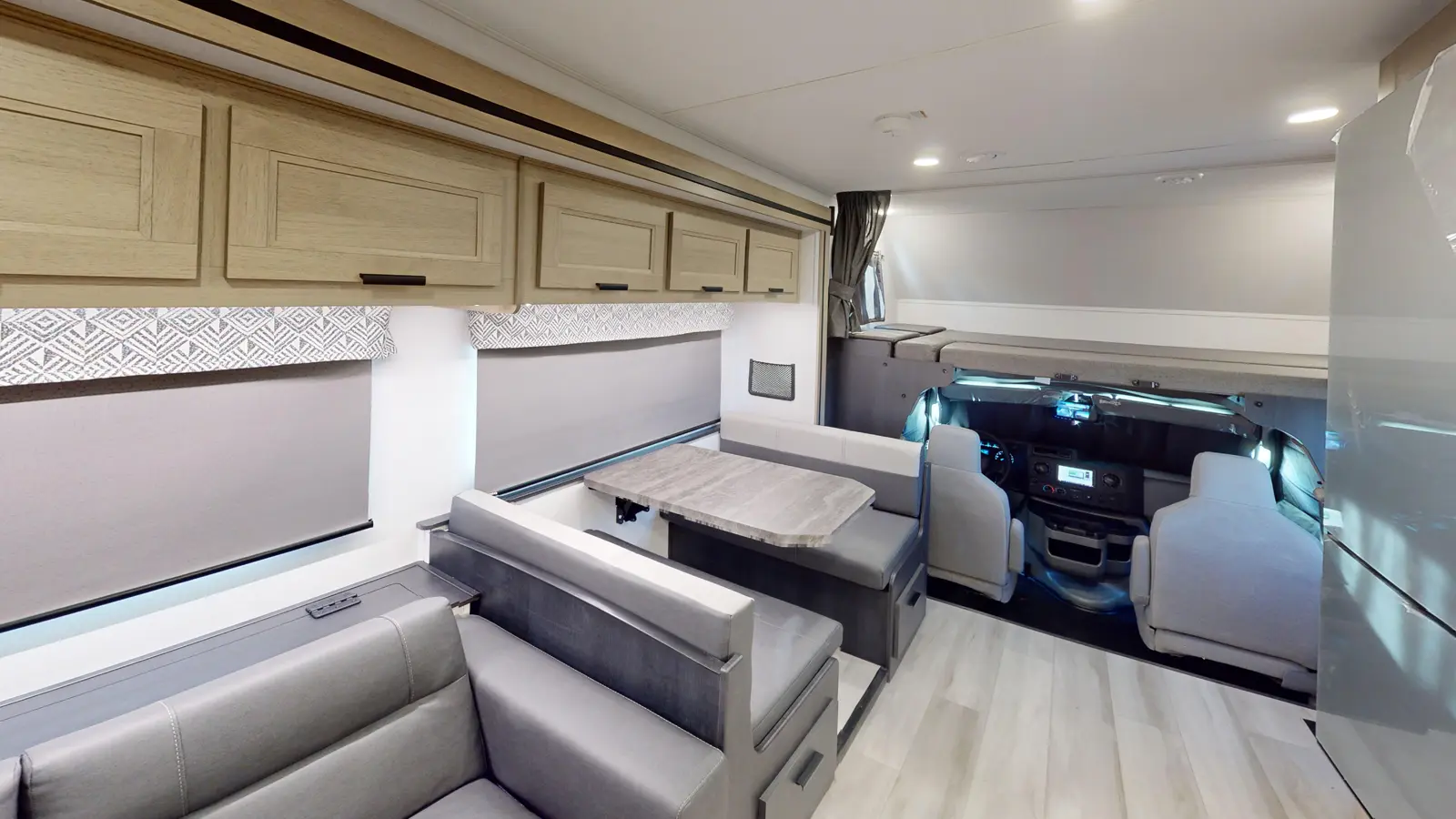 The Forester 2551DSLE kitchen features an undermount convection microwave and 10 cu. ft. refrigerator, plus a 12V TV with work station below. There's a pantry and wardrobe next to the bedroom. You'll enjoy a queen bed, a divider for privacy, and you can add your own TV thanks to the prewired location. The full bathroom includes linen storage just outside the door. And the furniture and bunk over cab provide sleeping space for your guests. This model is built on a Ford E450 chassis.