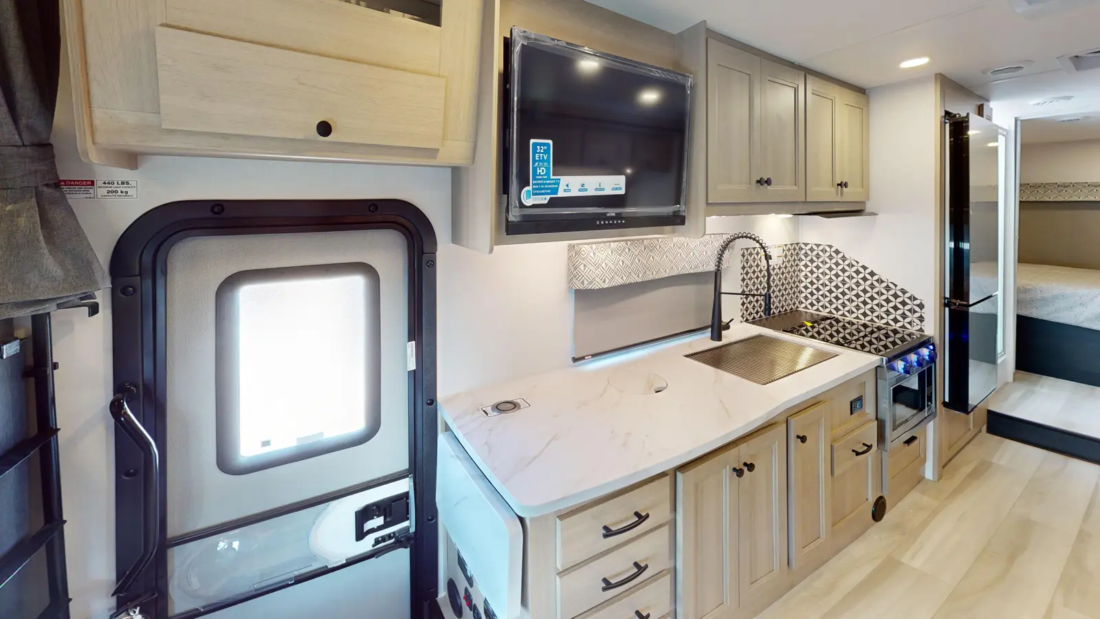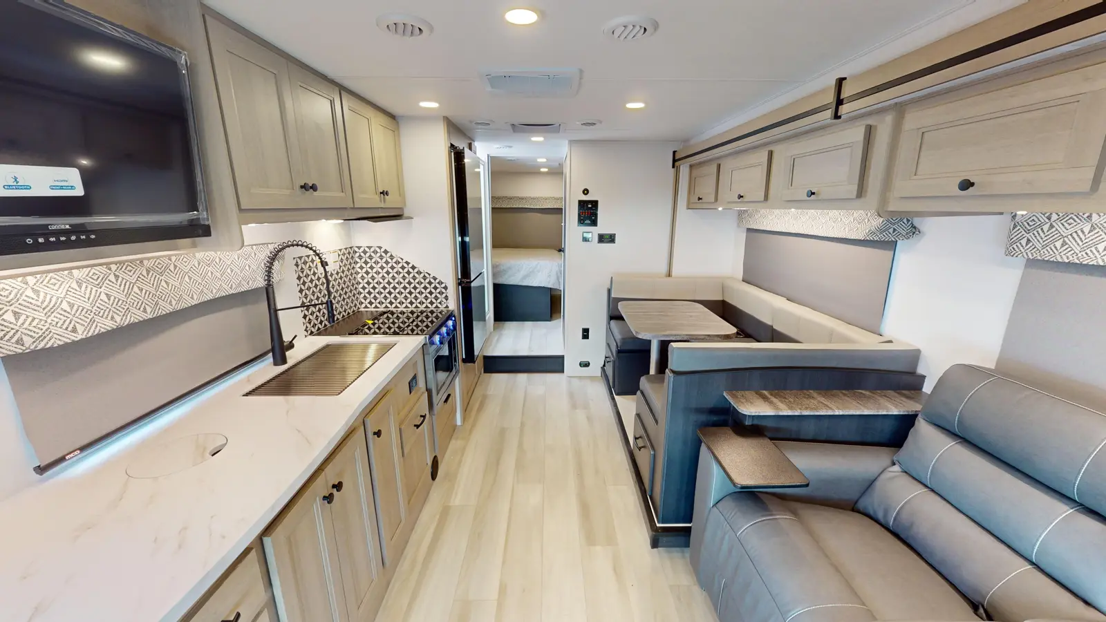 The 3011DS has 2 slide outs and sleeps 8. Outside, there's a 12V TV and storage compartments. Inside, you have a rear queen bedroom with a 60" x 74" walkaround bed and wardrobes, a split bathroom and a living area. The kitchen offers countertops, a pantry, 12V 10 cu ft refrigerator, convection microwave, and 3-burner stovetop. Overhead cabinets provide loads of storage. There's a large U-shape dinette next to a sofa (opt. 12V power theater seats). A cab over bunk provides a 60" x 80" mattress.