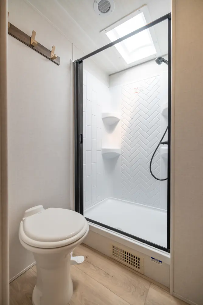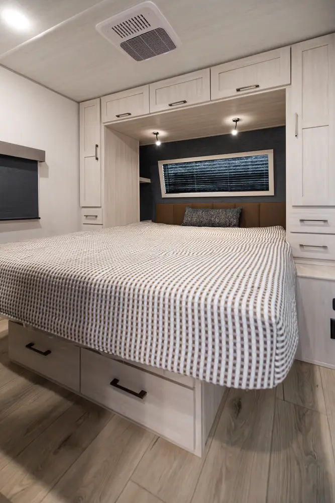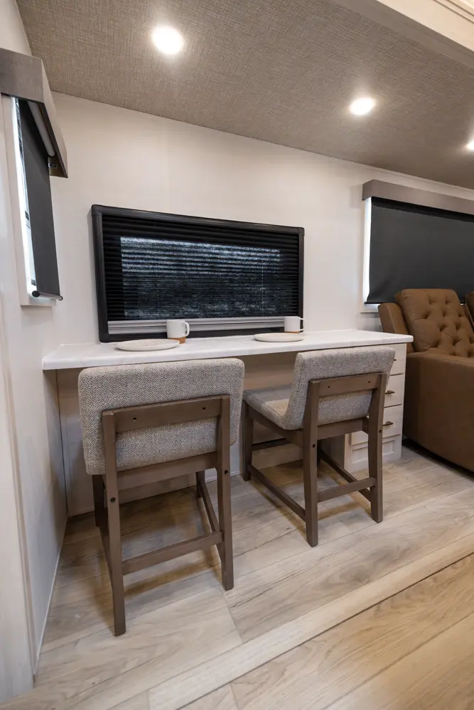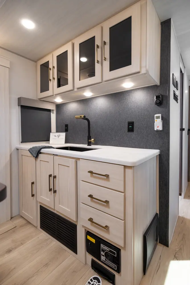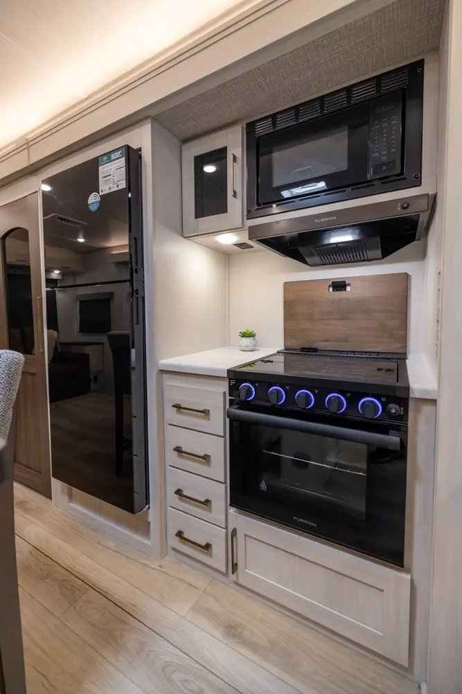 This 36' 7" travel trailer offers a spacious rear living area with dual opposing slides, creating an open, inviting space. The modern kitchen is equipped with a 10 cu. ft. 12V black glass refrigerator and a 3-burner residential-style range with glass cover. The custom king bedroom suite features ample storage, motion lighting, and a privacy wall. Exterior features include a 12' electric awning with LED lights, outdoor camp kitchen, TrailGate outdoor bar, and a hot & cold spray port.