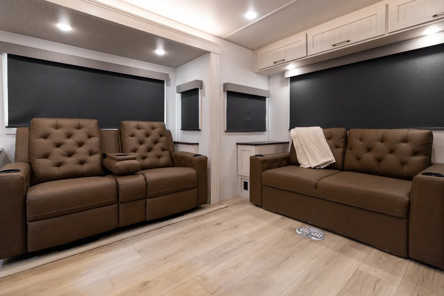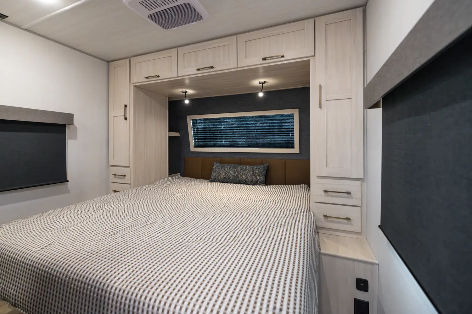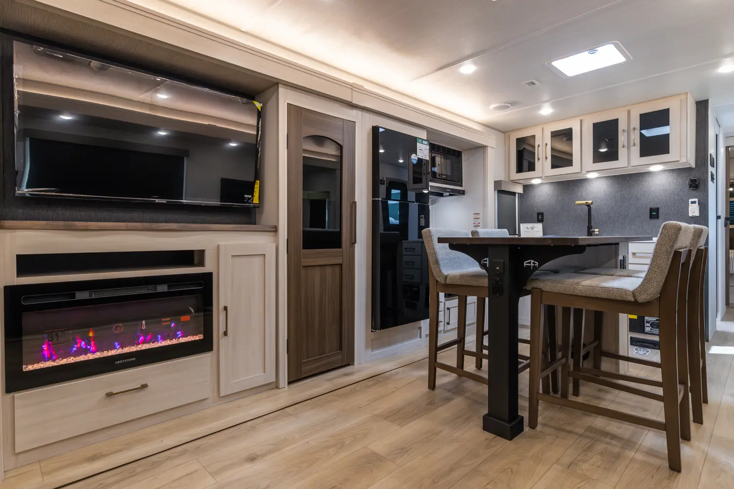 This 36' 7" travel trailer offers a spacious rear living area with dual opposing slides, creating an open, inviting space. The modern kitchen is equipped with a 10 cu. ft. 12V black glass refrigerator and a 3-burner residential-style range with glass cover. The custom king bedroom suite features ample storage, motion lighting, and a privacy wall. Exterior features include a 12' electric awning with LED lights, outdoor camp kitchen, TrailGate outdoor bar, and a hot & cold spray port.