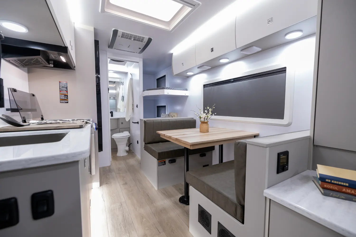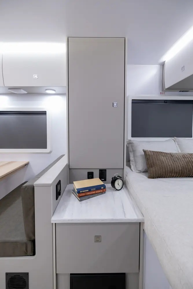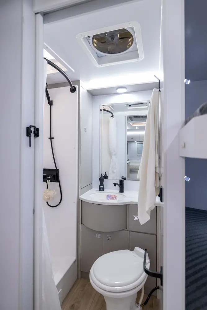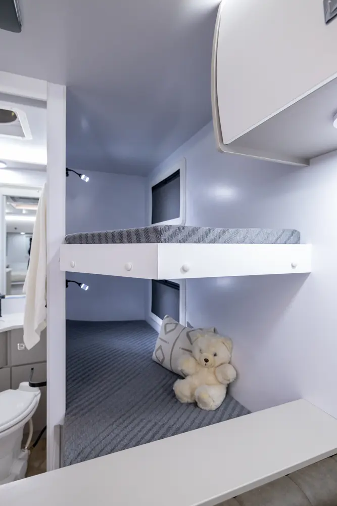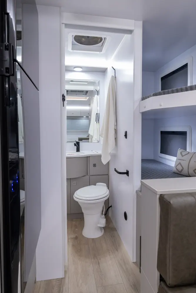 Bringing your mother-in-law on camping adventures is easier than ever with this floorplan! It features a full-size queen, 2 bunks, and a 4-person dinette that converts into an extra bed, ensuring comfortable sleeping for your family. The oversized passthrough storage area and 24 cabinets provide ample space for all your belongings. With the robust solar system, you can go off-grid and operate all trailer components.