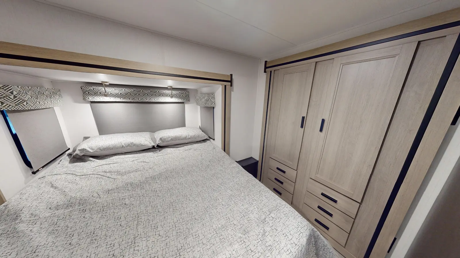 The 2500TS is a three-slide model that features a large queen bedroom with wardrobe closet and a roomy full bathroom that spans the width of the unit. The kitchen is ready for mealtime on the go with a cooktop, convection microwave, 12V stainless steel refrigerator, and sink with spray faucet. The large U-dinette can be swapped out for theater seating, depending on your preference. There's a cab over bunk that provides an additional sleeping surface or extra storage space.