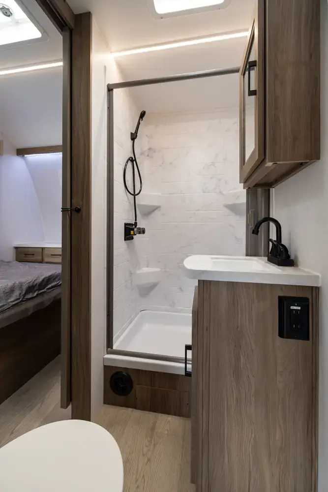 At 27' 5", the Work & Play 21LT expands garage room while still staying tow-friendly for outdoor enthusiasts. The large cargo bay handles your gear, and the interior supports both gear storage and comfortable breaks. Ideal for off-road adventures or family trailside escapes.